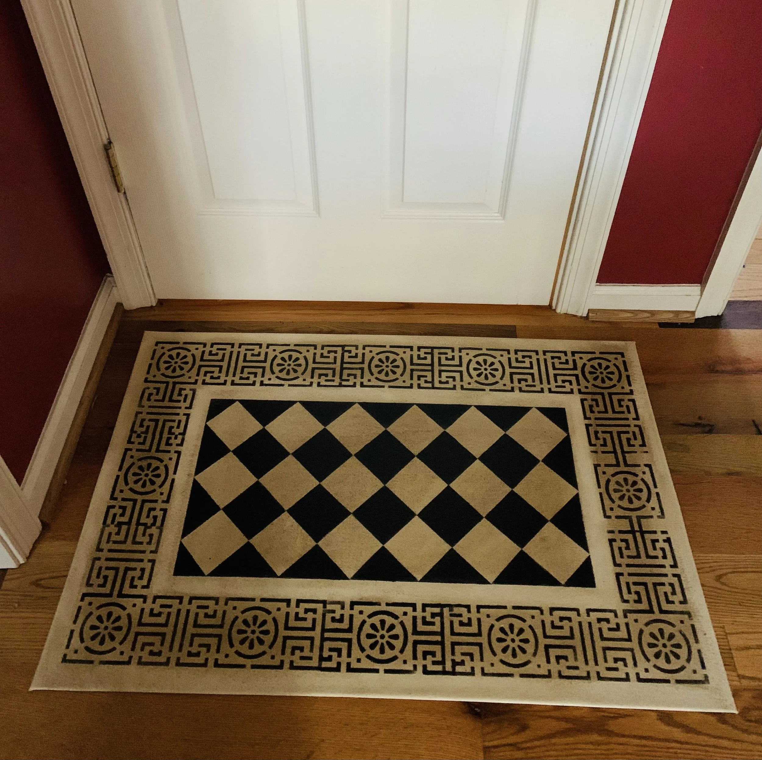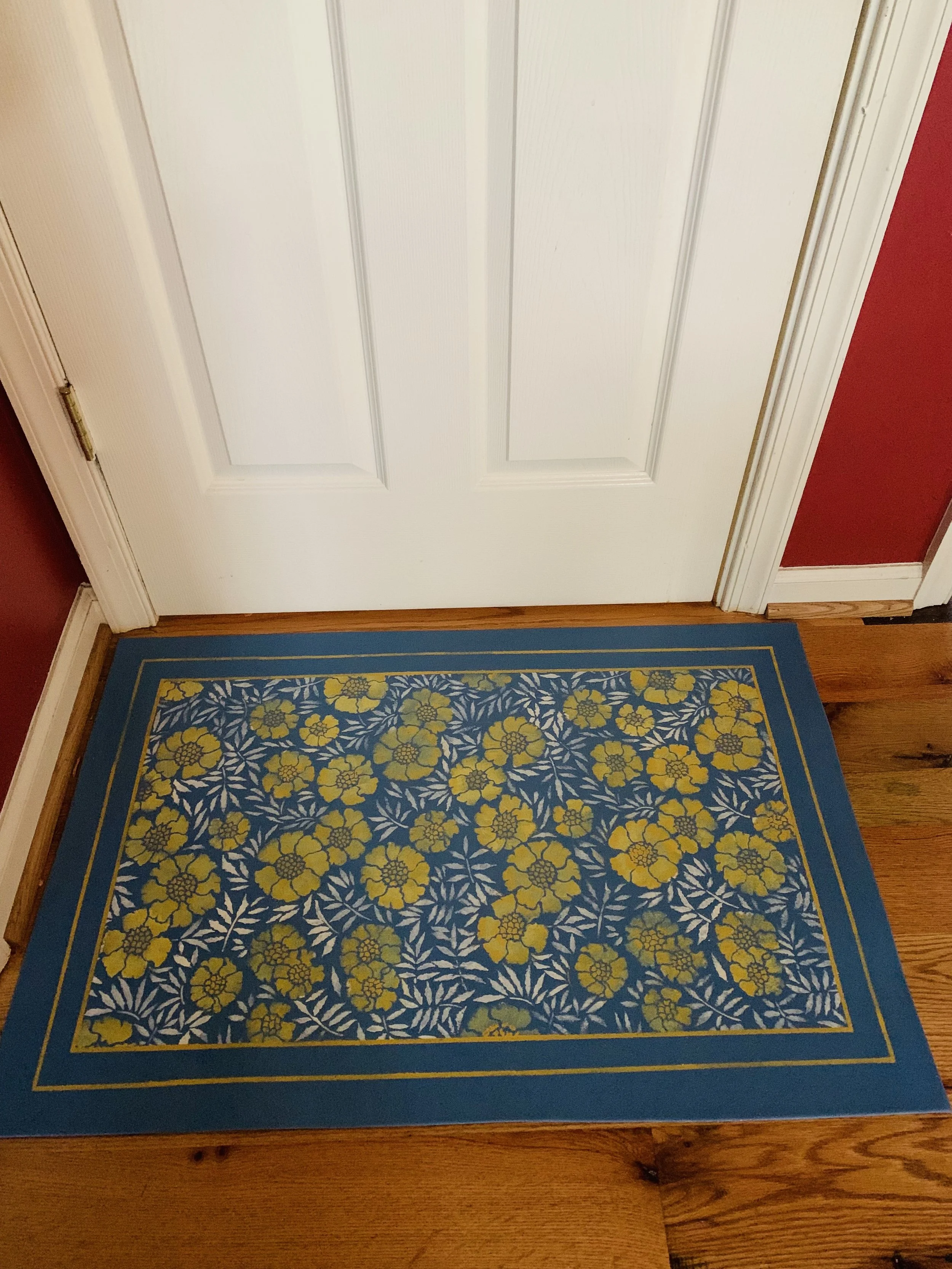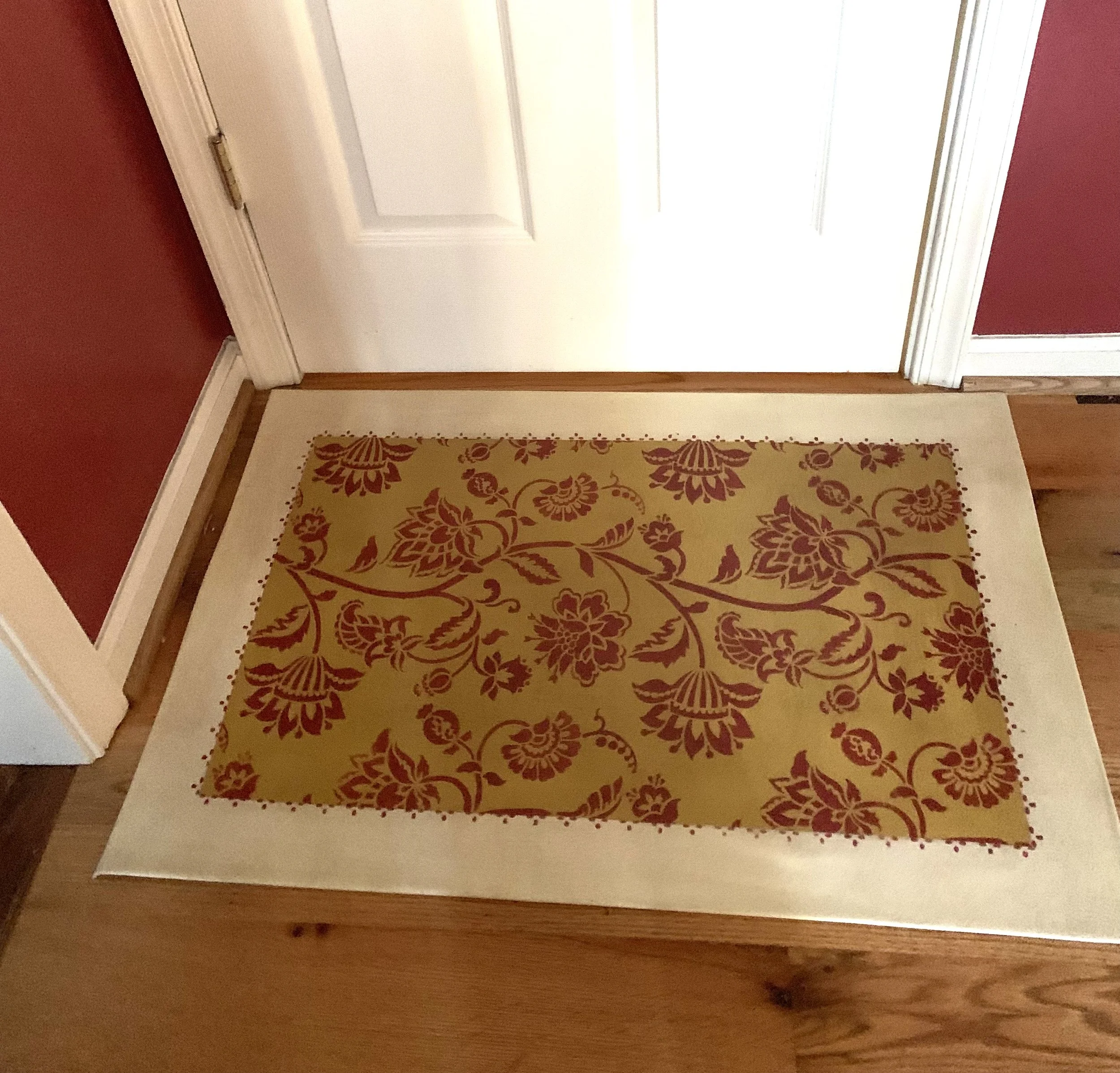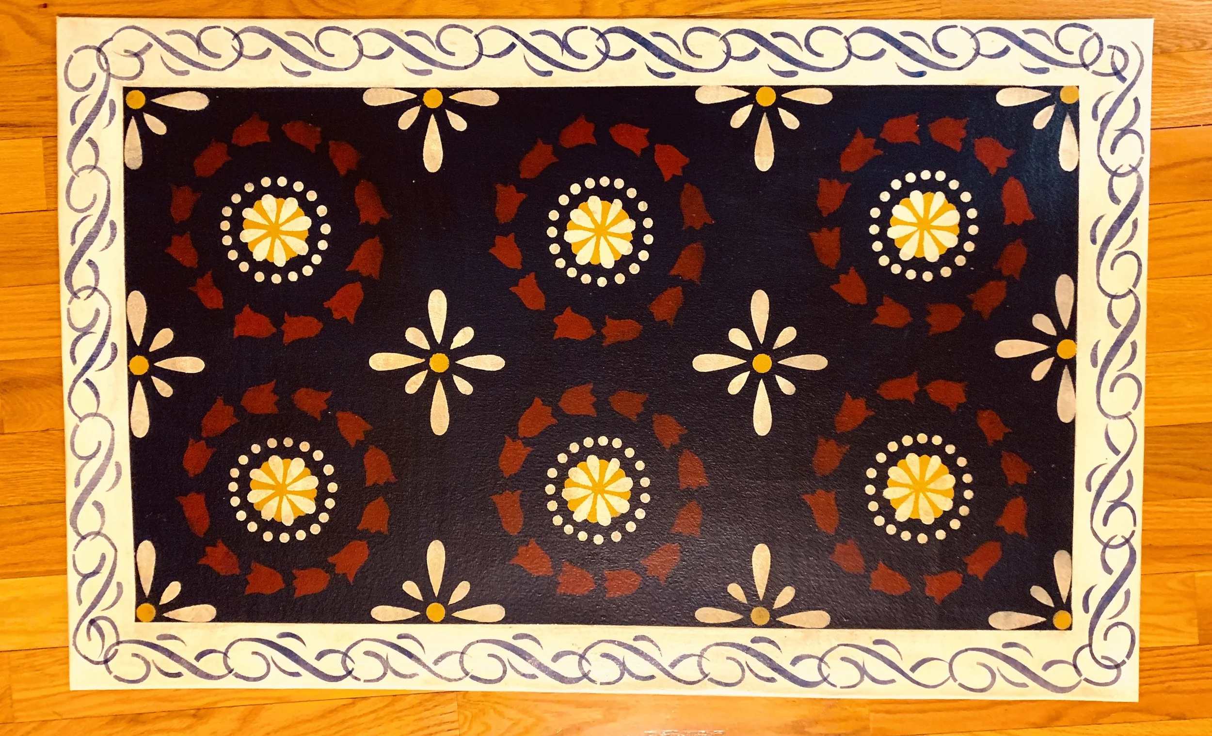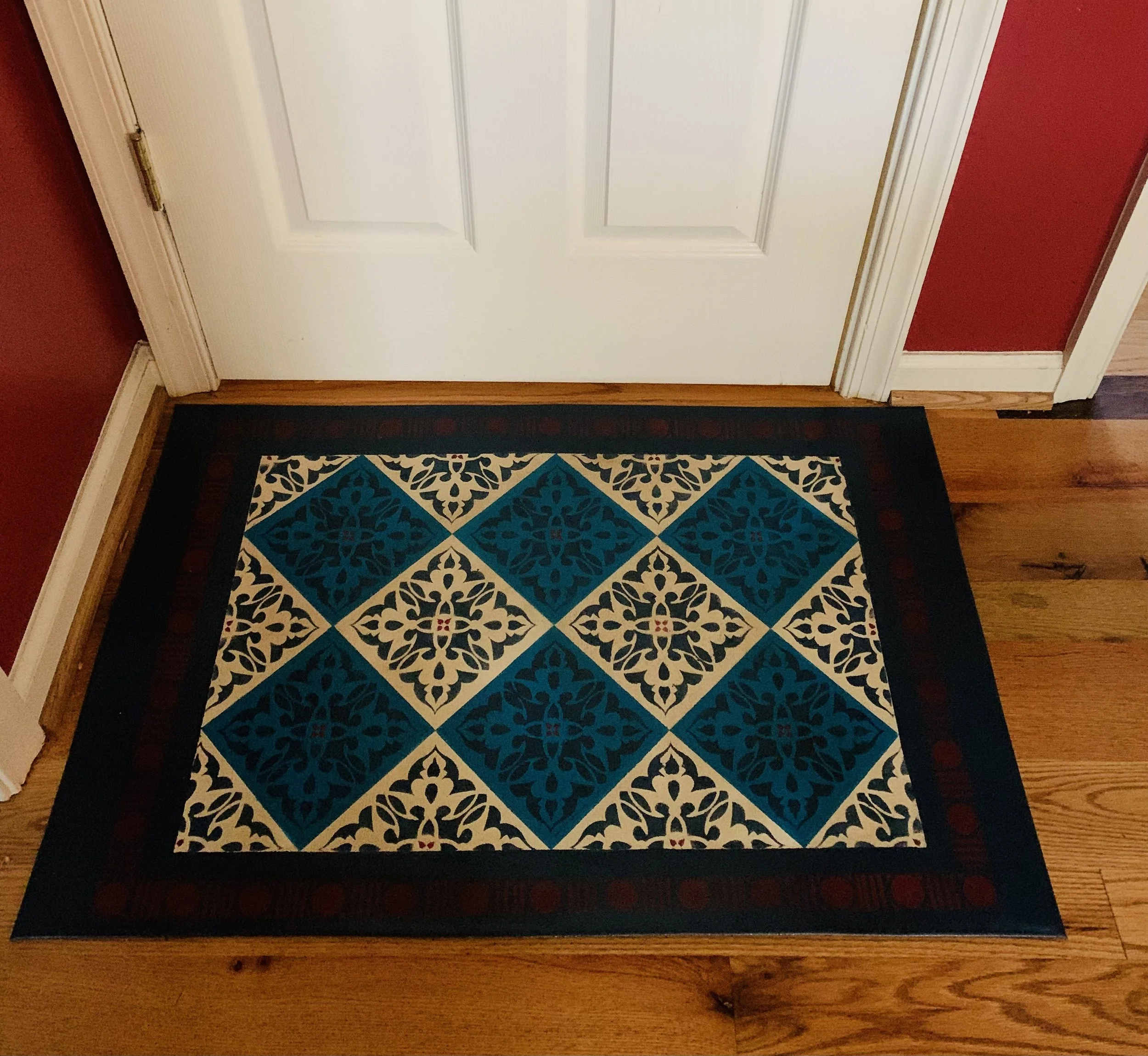 In-stock floorcloths are ready to ship in 2-3 days. Floorcloth items that are not in stock are custom made upon receipt of payment and can take 3-4 weeks completion, longer in humid weather due to curing time. Delivery time depends also on the size of your Floorcloth and amount of work I have at the time. No refunds available. Measure and choose your colors carefully.